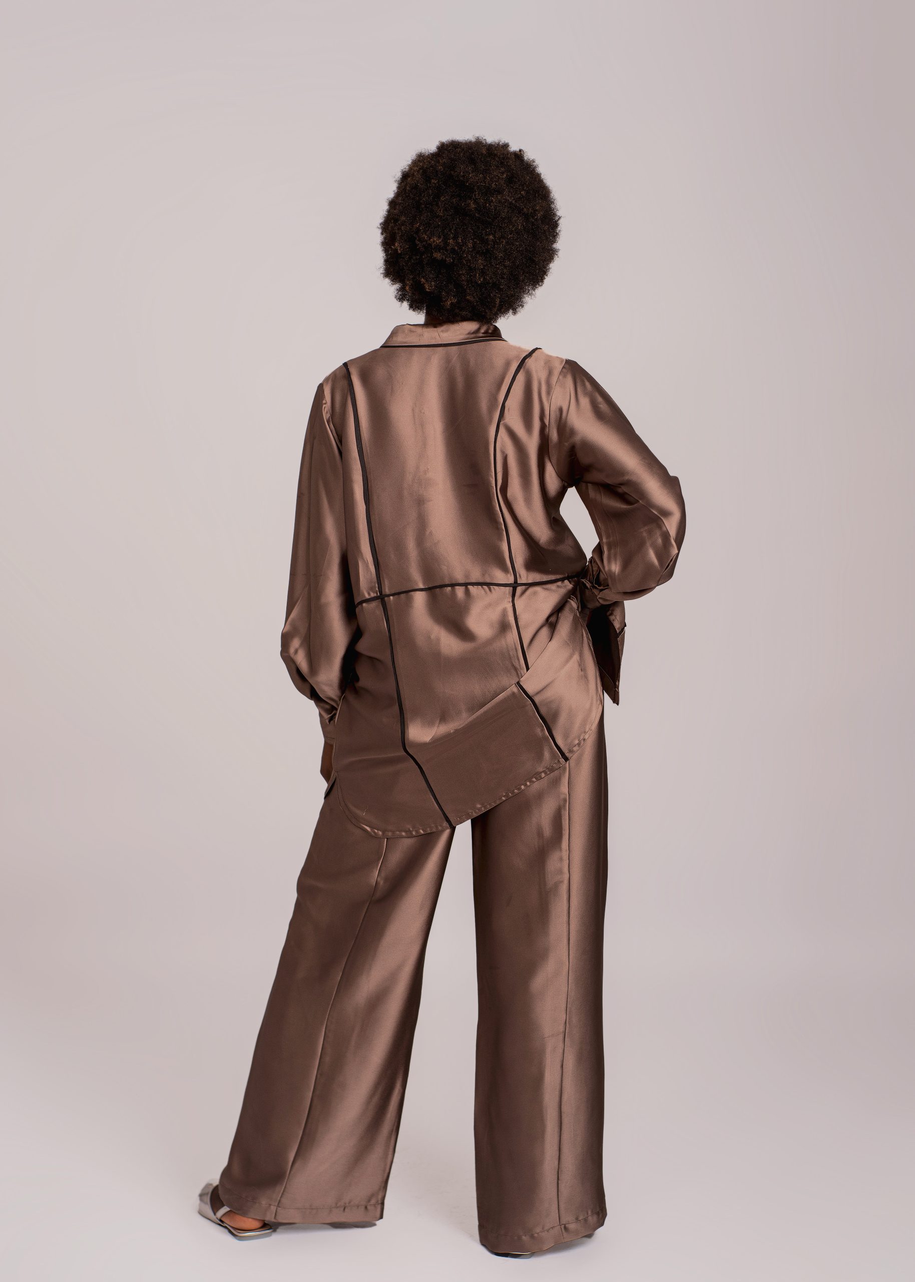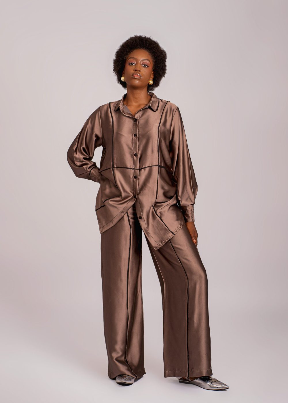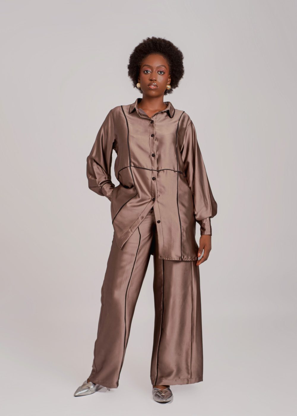 Elevate your wardrobe with our silver Silk Set – a sophisticated ensemble that draws inspiration from the structured elegance of a cage. The design cleverly incorporates both vertical and horizontal elements, creating a visually dynamic and fashion-forward statement.