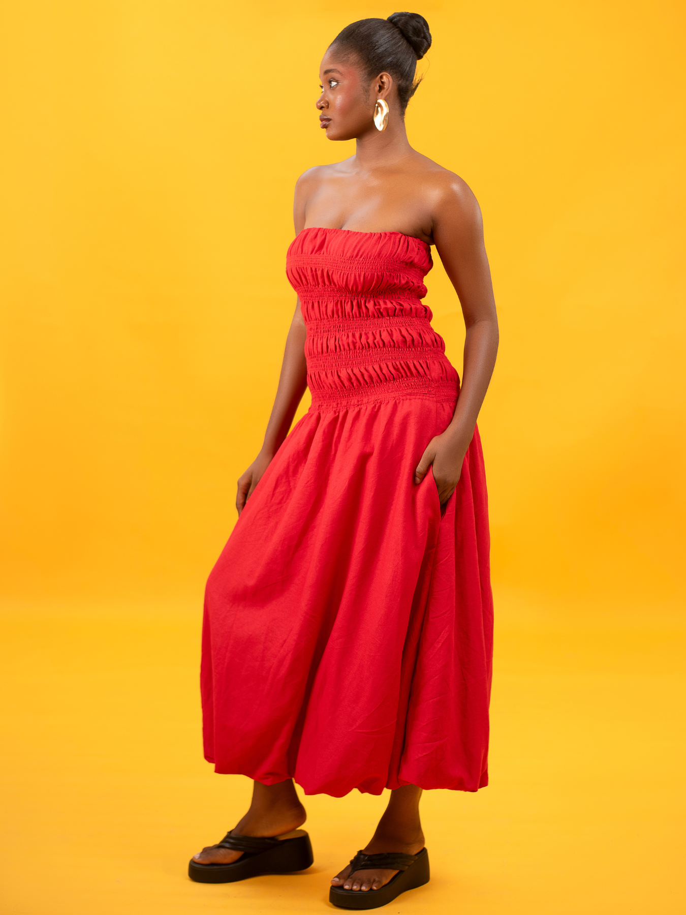 Bulb Midi Dress in Red Linen